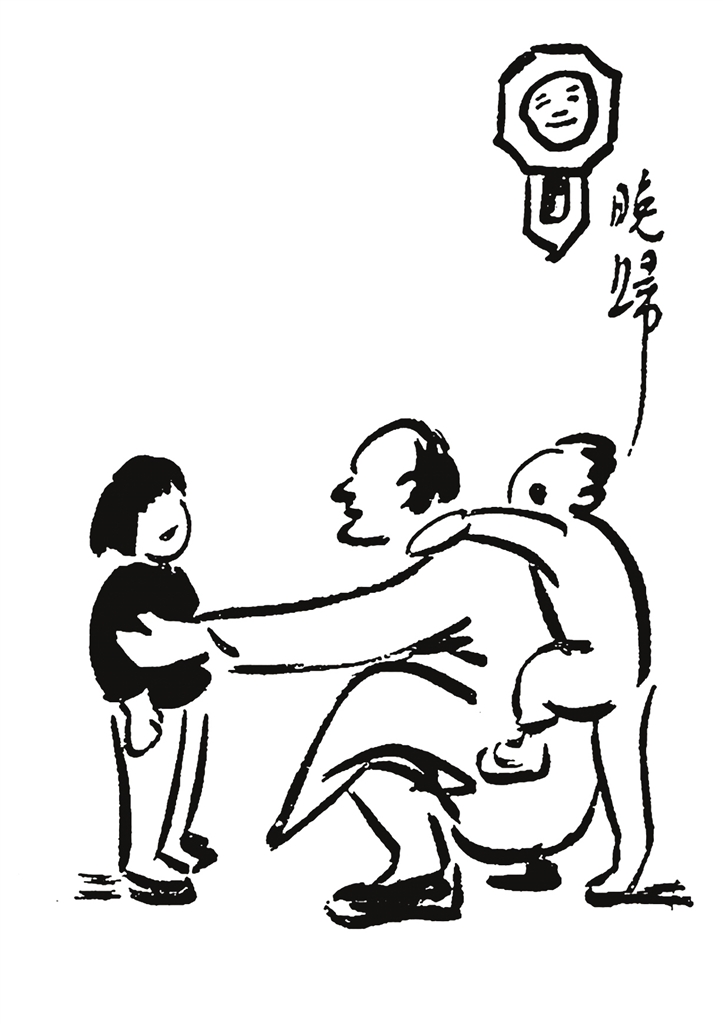漫画《晚归》直观而生动地体现出丰子恺先生为儿童画画的具有共同特性的姿态,那就是,他自己蹲下身,与儿童面对面平等平视,平和交流。从这个意义上说,《晚归》中的父亲就是丰子恺先生自己,或者是他的一种真诚情怀。这样的姿态,体现出对儿童的理解、尊重与平等相爱。我们知道,在日常生活中,无论在社会,还是家庭,总是以成人为本位的,因此,有意无意地把小孩子置于附属地位,成人看待小孩子,或与小孩子说话,也往往是俯视着——一种以上对下的姿势;小孩子看成人则需仰视——一种由下对上的姿势。这种状态,在生活图景中可谓习见不鲜。但是,作为艺术家的成人以小孩子为表现对象进行艺术创作时,这种姿势是不可取的。丰子恺先生对此是有体会、有自觉的。他说:“其实小孩子他们也自有感情,也自有其人生观、世界观及其活动、欲求、烦闷、苦衷,大人们都难得理解。我以前不曾注意此,近来家里的孩子们都长到三四岁以上,我同他们天天接近,方才感到,不禁对他们发生了深切的同情。推想世间一切小孩子,定然也如此。”因此,他主张无论是现实生活中,还是艺术创作,都应“设身处地为他们想起来”。像《晚归》这样的构图,在丰子恺先生的漫画中仅此一幅,但是,我们可以从他的大量的画小孩子的作品中,读出同样的情怀与姿态,那就是,他不居高临下,而是蹲下身与小孩子平等相待;他不心存旁骛,而是用心专注,看着小孩子说话。《晚归》可谓是一个艺术的象征。回应到前面的“小实验”,可以从丰子恺先生的表述中至少得到一个答案:因为他的创作“设身处地”为孩子们想,并且以平等面对的姿态相待,因此,为一代代的孩子们所喜欢。正所谓“精诚所至”,魅力永在!是的,凡人之心必有同然,这在小孩子身上体现得尤为显然,因其天真、率性的情趣尚未被世俗的东西所污染或遮蔽,所以,童心可以千古不变而互通;表现小孩子童真童趣的好作品,便可超越时空,千古不朽而常新。