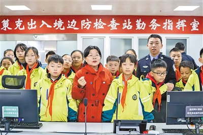去年以来,内蒙古边境上常常迎来一群特殊的小客人。这些身着白衬衫、胸前佩戴着鲜艳红领巾的少先队员,认真聆听着边境线上的坚守故事,时不时发出阵阵赞叹。这是内蒙古各级少先队组织开展“小石榴籽走边关”主题活动的生动写照,“小石榴籽”走进边境口岸、边防哨所,与边防战士共同巡逻、共同戍边,一堂堂生动的主题队课开在了北疆边境线上。