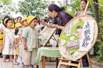 5月30日,老师在江苏省泰州市海陵区秋雪湖幼儿园给小朋友额头上点朱砂。端午节临近,各地举办丰富多彩的活动,迎接传统节日。 新华社发