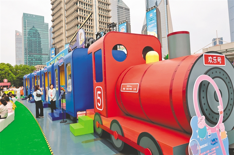 5月31日拍摄的“欢乐号”列车造型装饰。当日,“小猪佩奇中国环游记”主题快闪活动在上海东方明珠广播电视塔启动。高12米的巨型佩奇玩偶和“欢乐号”列车亮相东方明珠广场,在儿童节到来之际为上海的小朋友们带来难忘又特别的体验。 新华社记者 方喆 摄