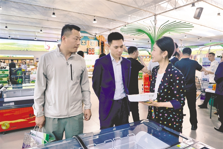 6月5日,经销商在介绍产品。当日,内蒙古优质农畜产品银行、保险系统专场产销对接活动在内蒙古优质农畜产品展销中心举办,全区12盟市3000余种内蒙古优质农畜产品集体亮相。本报记者 潘佳慧 摄