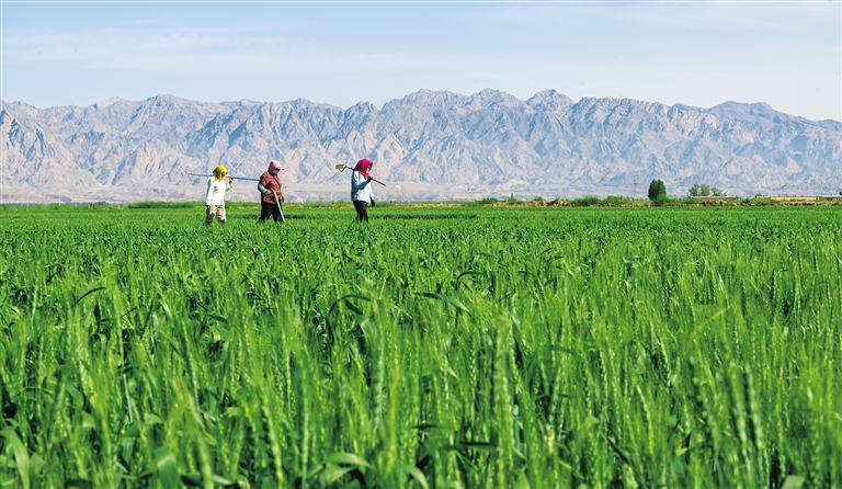 6月6日,巴彦淖尔市杭锦后旗蒙海镇红建村的农民前往麦田劳作。该镇建成了万亩小麦连片种植基地及麦后复种燕麦草基地,并对接中粮集团、河北金沙河等企业开展订单种植合作,解决农产品销售难题。2025年,巴彦淖尔市小麦种植面积达60.72万亩,目前小麦长势喜人,已进入抽穗期。本报记者 马骏驰 摄