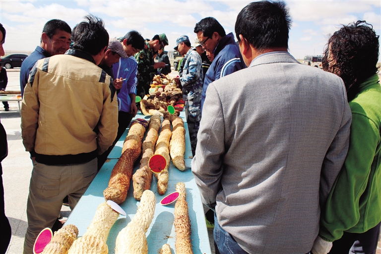 在沙产业发展规划的引领下,该旗还通过项目扶持,鼓励牧民发展沙草产业。2018年以来,阿拉善右旗先后在曼德拉苏木、阿拉腾朝格苏木、雅布赖镇建成3个万亩人工接种肉苁蓉基地。目前全旗累计人工嫁接肉苁蓉种植11.38万亩,去年全旗产肉苁蓉170.5吨、锁阳755吨,逐渐形成集种植、科研、加工、生产、销售于一体的产业链。
