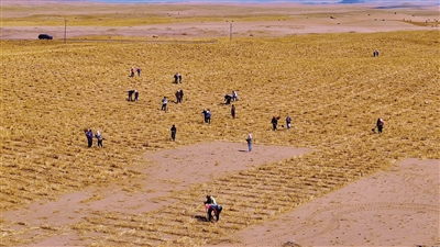 “我们的沙障采取的是1米乘1米规格的稻草方格,沙障铺好后,在方格里种植梭梭进行生物固沙。今年,阿拉善盟将完成锁边林草带空白区431公里治理,补齐防沙阻沙带上的‘缺口’和‘断点’,用1856公里的防沙阻沙带,有效遏制三大沙漠曼延汇合‘握手’之势。”阿拉善盟林草局局长图布新说。