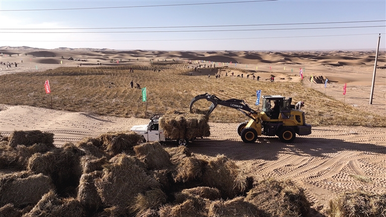 沙海起伏,机械轰鸣。连日来,在阿拉善盟巴丹吉林、腾格里两大沙漠交汇处的九棵树治沙区现场一派繁忙,一辆辆满载着稻草的运草车来往穿梭,将稻草源源不断地运到沙漠中,治沙工人们将稻草铺设整齐后,手扶式沙障机快速在沙中压固成一圈圈草方格。而在不远处连绵起伏的沙丘上,沙障机压固好的草方格纵横交错将一个个沙丘分割锁定,登高远眺甚是壮观。