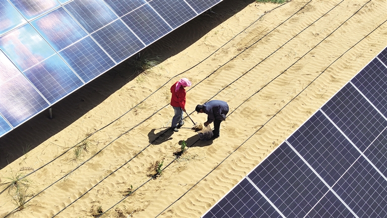 从黄沙滚滚到绿意浓浓,从铺设沙障到运用螺旋桩工艺安装光伏板,再到板下种植中草药固沙……当下,鄂托克前旗正通过“借光”发展、生态修复、拓展产业链等途径,不断提高土地、太阳能等多种资源综合利用效率,实现光伏发电与生态修复协同均衡发展。