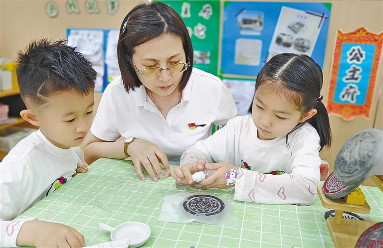 近日,呼和浩特市回民区第五幼儿园开展了“探秘中国房子”传统文化教育系列活动,由党员先锋岗教师走进班级进行试点教学,通过趣味化讲解窗棂、飞檐、瓦当等传统建筑构件,有效激发幼儿对传统建筑文化的兴趣,在孩子们心中播下传承和弘扬中华优秀传统文化的种子。图为党员教师教孩子拓印瓦当。蒋碧舟 摄