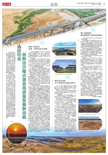 达拉特旗创新形成一整套库布其沙漠生态水土流失控制、生态重构、沙漠绿化标准化技术体系,通过以路治沙,成功将公路建设与治沙同步推进,实现了“地貌重塑、植被重建、景观重现”,以路治沙有效破解了荒漠地区开发与保护协同推进的重大课题,为黄河流域生态保护和高质量发展提供了低成本、易推广的实用技术,找到了人进沙退可持续发展新方案。