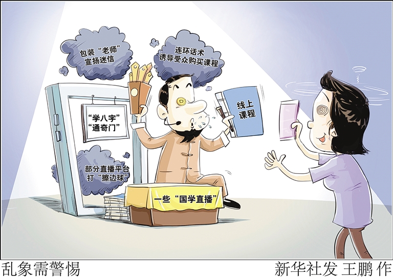 近期,一些网络直播平台账号以传播“国学”或“传统文化”的名义,引导受众购买价格动辄数千元、迷信色彩浓厚的线上课程,需引起警惕。新华社发 王鹏 作