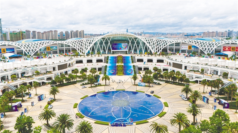 6月18日拍摄的第9届中国—南亚博览会举办地昆明滇池国际会展中心(无人机照片)。第9届中国—南亚博览会将于6月19日至24日在云南昆明滇池国际会展中心举行。场馆内,来自各国的参展商紧锣密鼓地进行布展工作,琳琅满目的特色商品陆续上架。