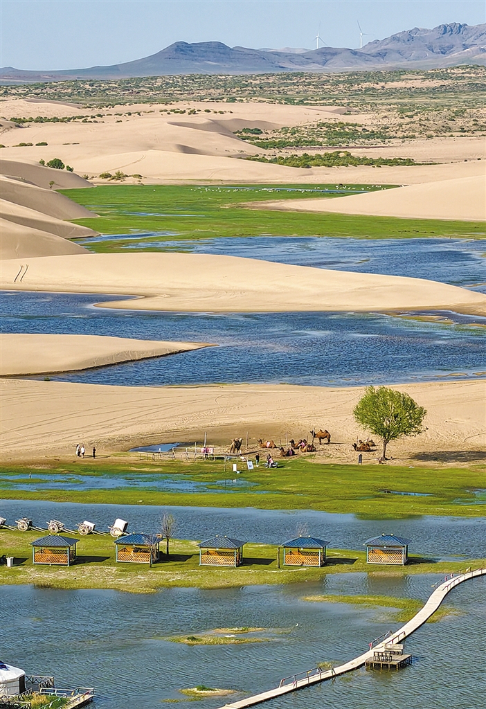 盛夏时节,漫步美丽的乌海湖畔,金色的乌兰布和沙漠与湛蓝的湖水相映成趣,一湖诗画尽揽入怀。近年来,乌海市结合乌海湖景区大湖、大漠的资源优势,开发了水上环湖观光游、沙海体验游、小火车观光游等旅游路线,并拓展了游艇、快艇、水上飞人、沙漠越野车、沙漠骆驼等20余种水上沙漠娱乐项目,“来沙漠看海”成为乌海市最为响亮的旅游标语。