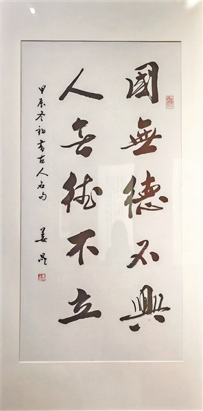 在展览中,还有中央文史研究馆姜昆馆员带有行草特点的书法作品:“国无德不兴,人无德不立”。其中三个字重复出现,写法却不同。尤其是“德”字,既有行书,又有草书,就是在警醒人们,无论务实还是追梦,行为必须“外得于人,内得于心”,才算一个有道德修养的人。而陈平原所书“学不分东西南北,思常在上下古今”的隶书作品,则是借助书法的审美形式,在佐证中华民族命运共同体的历史根脉,也在激励后学不忘历史,踔厉奋发。