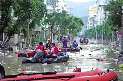 6月28日,救援人员帮助榕江县城内居民撤离。经会商研判,贵州省榕江县人民政府防汛抗旱指挥部决定从2025年6月28日12时30分起,将第6号防汛Ⅱ级应急响应提升为防汛Ⅰ级应急响应。目前榕江县各单位、部门正在组织城区群众转移到安全地带。 新华社记者 刘续 摄