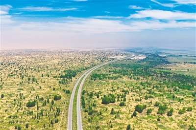 七月的阳光洒在库布其沙漠北缘的林子里,沙柳树、沙枣树、杨柴、柠条等植物迎着光坚韧生长着,在鄂尔多斯市杭锦旗境内形成锁边林带缚住沙海。