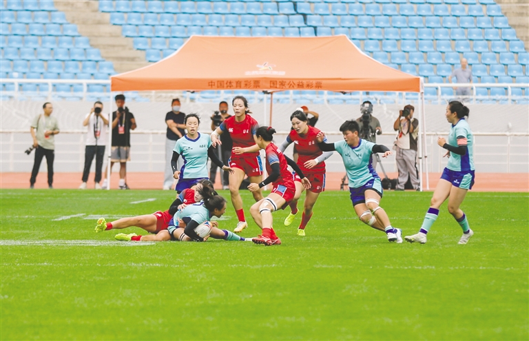 7月4日,橄榄球运动员正在赛场上奋力拼抢。当日,为期3天的第十五届全国运动会7人制橄榄球项目资格赛第二站(落选赛)在呼和浩特体育场开赛。本报记者 孟和朝鲁 摄