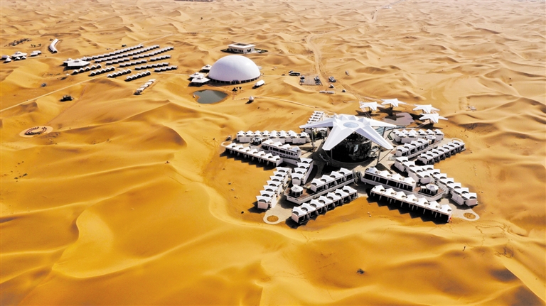 在林草带包围中,一片黄沙专门被留下来发展旅游。近几年来,星星酒店、沙漠宿集、野奢帐篷等一批创意文旅项目在此落地,价格不菲却备受热捧,成为宁夏文旅的“流量担当”。