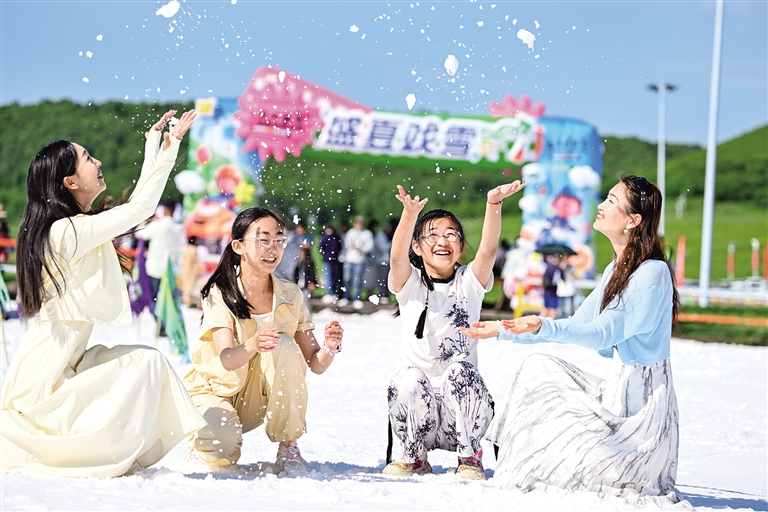 7月11日,游客们在呼伦贝尔市牙克石凤凰山景区避暑纳凉,享受另类的夏日冰雪乐趣。当天,“歌游内蒙古 夏至呼伦贝尔”2025牙克石凤凰山雪夏欢乐季活动开启。近年来,当地依托区域特色、利用森林生态资源、冰雪资源,不断丰富旅游产品、提升旅游服务品质,让旅游与森林、草原、冰雪相拥,推动文旅产业高质量发展。本报记者 王晓博 摄