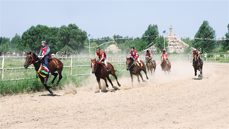 7月11日,通辽市第二届速度马常规赛暨茫汗苏木哈图嘎查第19届那达慕大会开幕。本次那达慕大会共设赛马、搏克两大项目。来自全区各盟市的30余名骑手和160余匹骏马同场竞技;搏克赛场则吸引了64位摔跤职业选手与爱好者参与角逐,为游客呈上一场速度与激情、力量与技巧交织的文体盛宴。 本报记者 鲍庆胜 摄