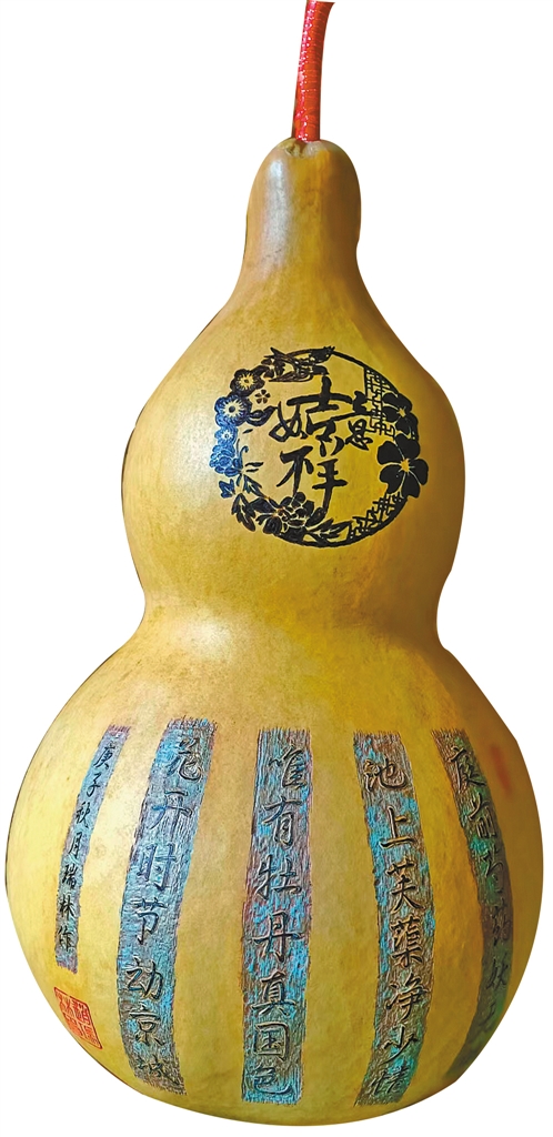 阳光透过窗户洒在案几上,大大小小的葫芦泛着温润的光泽,赵瑞林凝神屏息,以刀为笔,在葫芦上勾勒出细腻的纹路。