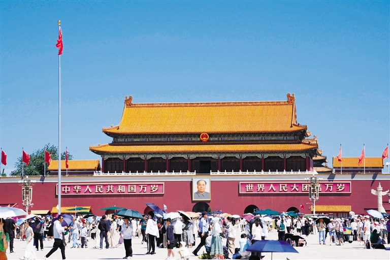7月17日拍摄的天安门城楼。北京市人民政府天安门地区管理委员会2025年4月28日发布通告称,天安门城楼自2025年5月6日起暂停对外开放,以进行设备维护和检修工作。目前,天安门城楼的施工围挡已经拆除,重新亮相,但恢复开放时间另行通告。