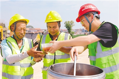 7月17日,在河南省焦作市武陟县的沿黄高速沁河特大桥项目施工现场,项目部工作人员为工人盛绿豆汤。高温持续,各地开展暖心活动,为劳动者送上关爱。 新华社发
