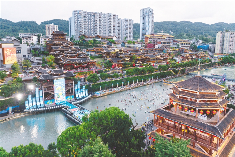 7月19日,市民和游客在湖北省宣恩县城贡水河上戏水(无人机照片)。近年来,湖北省宣恩县“以水为媒”,利用贡水河穿县城而过的优势,在河上开展群众喜闻乐见的亲水、戏水系列活动,沿河两岸布置灯光系统,把山区县城建成休闲避暑、观赏夜景的旅游目的地。 新华社发