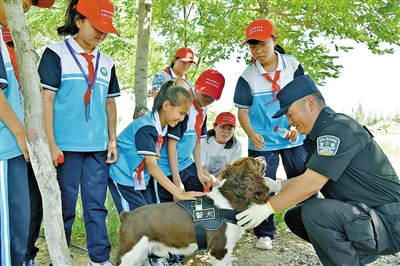 在乌海市公安局刑事侦查支队警犬大队,警犬驯导员向孩子们介绍了不同品种警犬的特点和习性。当看到威风凛凛的罗威纳犬、机警灵活的史宾格犬等“特殊警员”时,孩子们兴奋不已,纷纷驻足观察。随后,训导员现场展示了警犬的服从性训练和实战技能。在指令下,警犬们完成了搜爆搜毒、扑咬“嫌疑人”等科目,动作精准利落,赢得了孩子们的阵阵掌声与欢呼。期间,训导员还结合案例,向孩子们讲解了警犬在维护社会治安、打击违法犯罪中的重要作用,以及日常训练的艰辛。