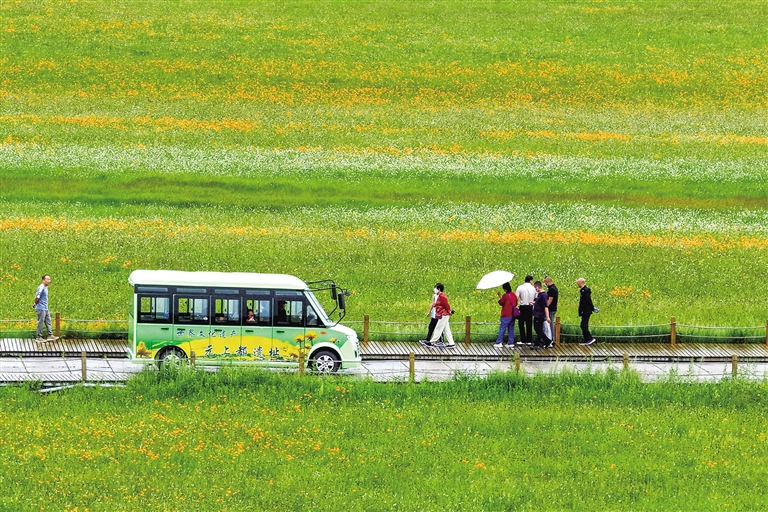 7月26日,伴随着蒙蒙细雨,游客在锡林郭勒盟正蓝旗境内的金莲川草原欣赏盛开的金莲花。盛夏时节,金莲川草原变成了一片金色的海洋,美不胜收,吸引了大批游客前往观赏。该旗借机推出文艺演出、搏克竞技、低空飞行等特色活动引客留客,让游客更好地感受草原风情。 本报记者 王晓博 摄