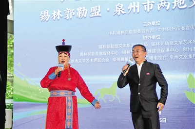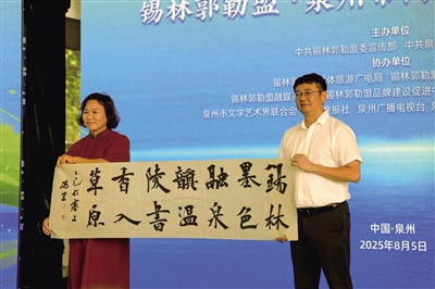 当马头琴的弓弦一振,《万马奔腾》的旋律便如潮水般涌来,锡林郭勒盟乌兰牧骑队员的指尖下,骏马的嘶鸣、蹄声的铿锵穿透时空,将现场观众瞬间拽入锡林郭勒的辽阔草原——那里天似穹庐,笼盖四野,风吹草低见牛羊的景象在乐声中栩栩如生。紧接着,蒙古族长调《走马》响起,那苍凉而悠扬的曲调,像草原上的长风,带着游牧民族对生活的热爱,在泉州的空气中回荡。更令人称奇的是两地艺术家同台演绎的《敖包相会》,蒙古长调的悠远与闽南语的温婉在此刻完美融合,草原的星空与闽南的月色仿佛在歌声中交相辉映,让在场的观众真切感受到“各美其美,美美与共”的深刻内涵。活动中,锡林郭勒盟文艺家赠予泉州市委宣传部书法作品“锡林墨色融泉韵,温陵书香入草原”,短短十四字,不仅是对两地文化特质的精准概括,更道破了本次活动“交融共生”的核心主题。