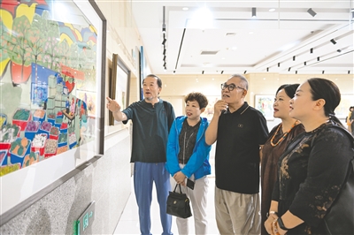 8月12日,观众在参观画作。当日,“石榴结硕果 和美新时代”第三届民族地区五城市美术作品交流展在呼和浩特市文化馆开展。展览汇聚南宁、呼和浩特、喀什、银川、山南五地的100幅优秀美术作品,涵盖中国画、油画、水彩画等多个门类,内容聚焦民族团结进步、乡村振兴、城市建设、民俗风情四大主题。本报记者 王磊 摄