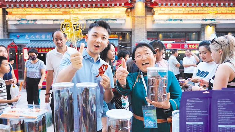 8月15日,游客在巴彦淖尔市黄河湾步行街品尝非遗美食糖画、炭烤牛肉干。连日来,“北疆拾遗 生生不息”内蒙古自治区非遗购物月在巴彦淖尔市持续火热进行。活动汇聚了全区60余项非遗产品,线上平台和线下摊位同时售卖,8月9日开幕至8月13日,销售额已过百万元,在展示古老非遗技艺的同时有效拉动了文旅消费。本报记者 冯雪玉 摄