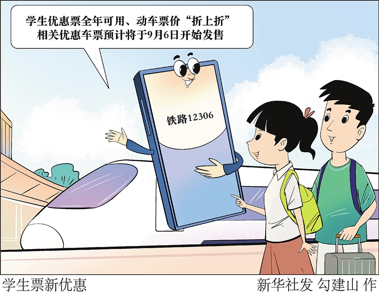 近日记者从中国国家铁路集团有限公司获悉,铁路部门将优化学生旅客购票出行措施,推出学生优惠票全年可用、动车票价“折上折”,让学生购票出行更加灵活方便、得到更多实惠。相关优惠车票预计将于9月6日开始发售。 新华社发 勾建山 作