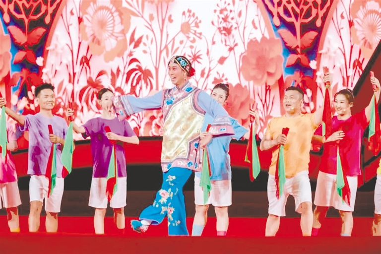 鼓曲联唱《五十六朵并蒂花》堪称这种“多元共生”理念的典范。作品将河南大调曲子、三弦书、河洛大鼓等本土鼓曲与少数民族音乐舞蹈元素有机熔铸,通过“盛世牡丹”“雪域风情”“漓江两岸”“草原高歌”“天山脚下”等主题段落,以象征各民族的花卉为意象载体,在舞台上铺展成一幅绚丽的民族文化交融画卷。其演绎的“五十六个民族一家亲,常青树共开一朵并蒂花”,既是对“五十六个民族像石榴籽一样紧紧抱在一起”理念的艺术化表达,更彰显了中华文化“多元一体”的深层凝聚力。