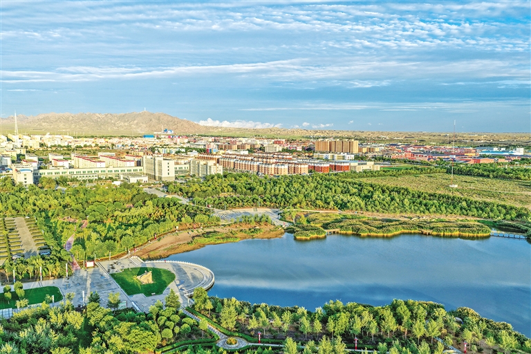 8月21日,巴丹吉林沙漠腹地的阿拉善盟阿右旗美景醉人。近年来,当地持续加大生态修复项目力度,全方位提升城镇品质,打造宜居宜业宜游的“零碳小镇”,实现生态与宜居完美融合。本报记者 王晓博 摄