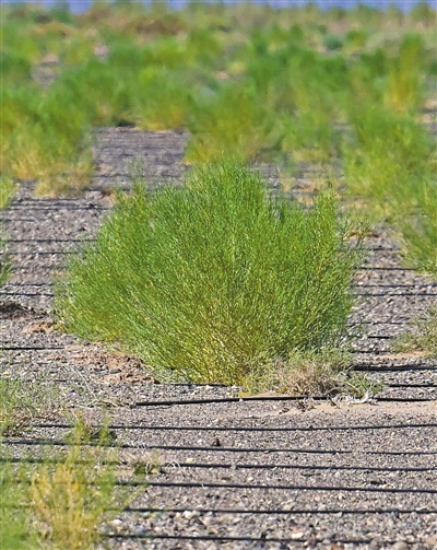 8月下旬,已入秋季,阿拉善盟额济纳旗的气温依旧居高不下。烈日炙烤着大地,一株株嫩绿的梭梭顽强生长,让一望无际的沙地上有了生机。