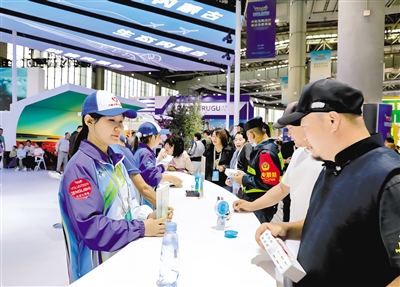 8月28日,中蒙博览会现场,志愿者在咨询台为参展民众提供服务。据了解,此次参加中蒙博览会的320名青年志愿者经过专业培训,在博览会上发挥自己的作用,成为了一道独特的风景。本报记者 潘佳慧 摄