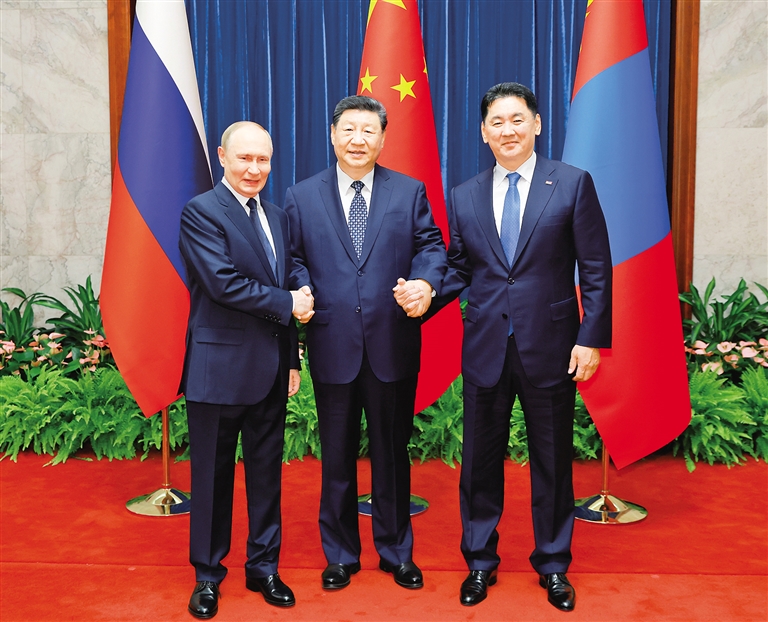 习近平指出,近年来,中俄蒙三方合作稳步发展,取得实实在在的成果。三方合作中期路线图顺利实施,三国贸易额节节攀升,经贸、科技、生态保护、人文合作不断深化。作为山水相连、休戚与共的友好邻邦,中方愿同俄方、蒙方一道,坚守合作初心,排除外部干扰,携手推动三方合作高质量发展。