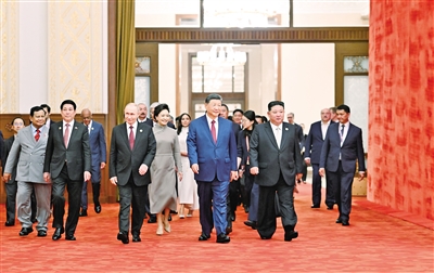 在喜庆欢乐的乐曲声中,习近平同中外嘉宾一起举杯,共同庆祝中国人民抗日战争和世界反法西斯战争的伟大胜利,共同祝愿世界和平。