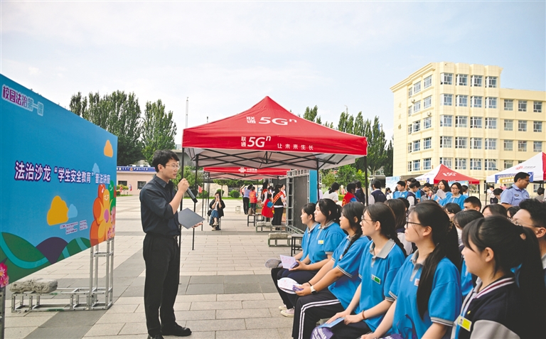 9月11日,一名律师正在为学生讲解安全教育方面的法律法规。当日,呼和浩特市教育局在呼和浩特市商贸旅游职业学校举办“法治护航开学季 青春筑梦向未来 —— 开学普法第一课 法治开放日”活动,旨在进一步增强学生们的法律意识。本报记者 牟野 摄