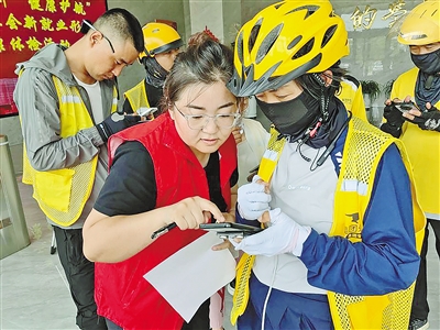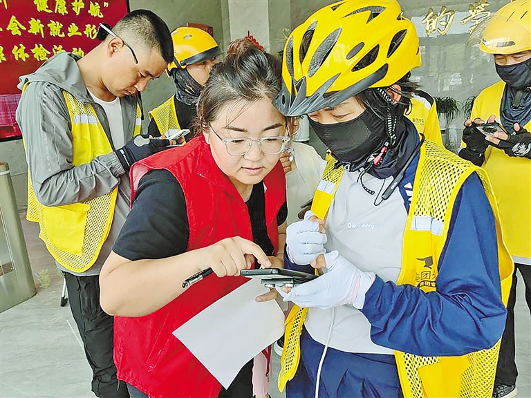 近日,鄂尔多斯市鄂托克前旗聚焦新就业群体,通过开展健康体检、义剪、法律咨询等各类暖“新”活动,不断提升新就业群体的获得感、幸福感与归属感。图为党员志愿者为外卖员发放健康体检卡并提供体检引导。曹瀚文 摄