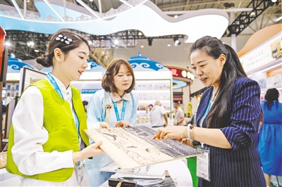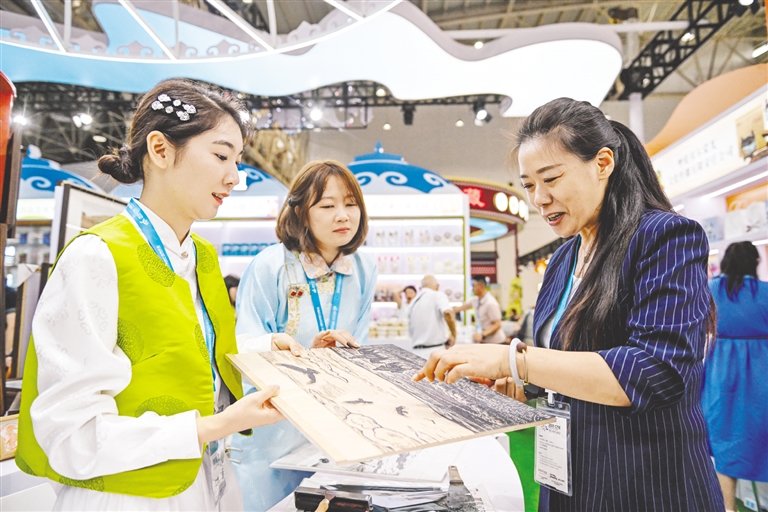 9月13日,扎鲁特版画亮相2025中国文化旅游产业博览会。据了解,近年来,通辽市扎鲁特旗文联主动搭建桥梁,积极推动版画艺术与市场需求精准对接,助力这项技艺“活起来”,走出去。本报记者 王磊 摄