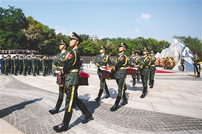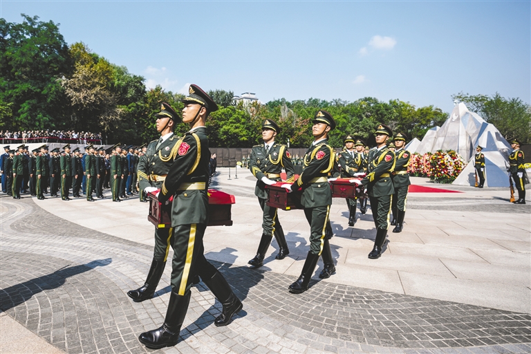 9月13日,礼兵护送志愿军烈士棺椁走向沈阳抗美援朝烈士陵园安葬地宫。9月13日,第十二批在韩中国人民志愿军烈士遗骸安葬仪式在沈阳抗美援朝烈士陵园举行。30位志愿军烈士英灵,在阔别祖国70多年后回到中华大地安息。 新华社记者 潘昱龙 摄