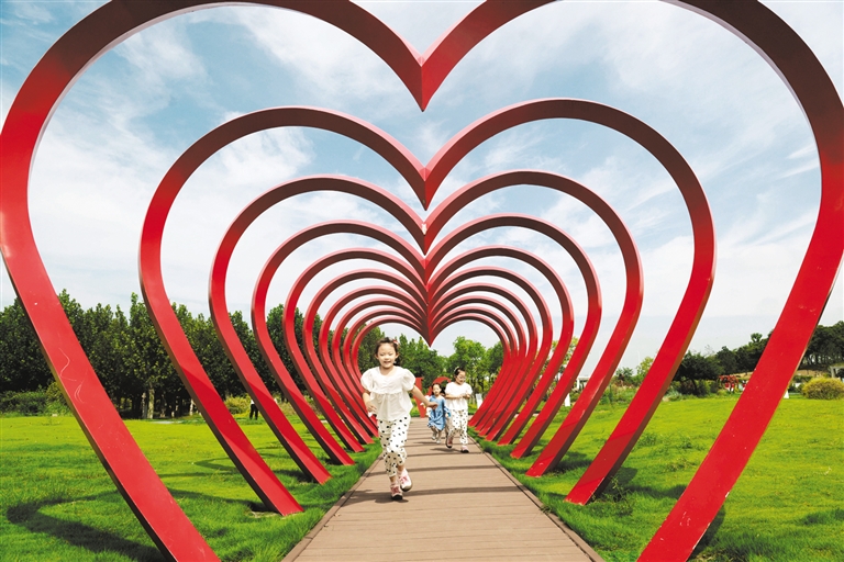 9月13日,小朋友在山东省临沂市河湾公园玩耍。金秋时节,人们利用周末出游赏景,乐享自然。 新华社发