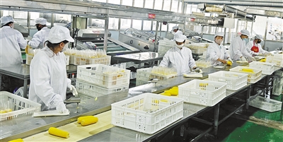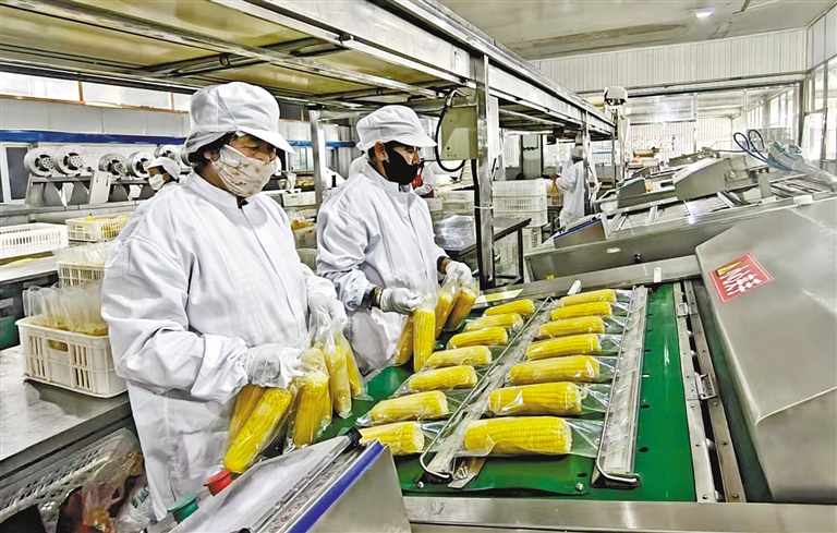 来到加工车间,真空包装生产线正在高效作业。该技术将鲜食玉米的保鲜期延长至12个月,彻底突破季节限制。“目前我们每天可处理鲜玉米14万穗,其中速冻玉米10万穗、真空包装4万穗,全部通过有机认证。”生产负责人谭宝龙介绍:“从采收至成品共设18道工序,严格执行国家食品安全标准。”