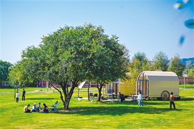 10月2日,在呼和浩特市新城区大青山南坡一个特色小镇内,游人正在享受假期悠闲时光。国庆假期,到城市周边特色小镇“微度假”已经成为一种旅游新时尚。本报记者 孟和朝鲁 摄