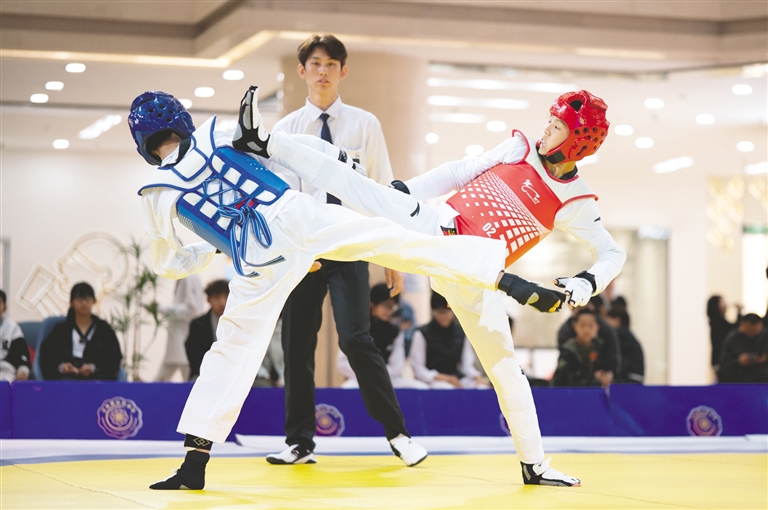 10月2日,在呼和浩特市茂业摩尔城商厦,跆拳道男子组的选手在比赛中。当日,2025年沿黄城市跆拳道校际联赛呼包鄂乌系列赛暨呼和浩特市跆拳道后备人才选星计划拉开帷幕。本次比赛共吸引来自4个沿黄城市的312名青少年运动员参赛,赛程为期4天。 本报记者 怀特乌勒斯 摄