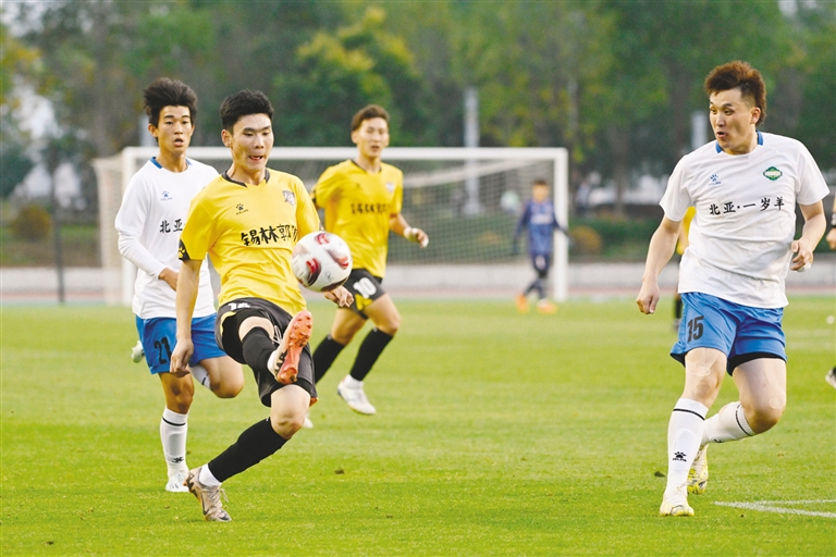 10月4日,在呼和浩特市国家北方足球训练基地,锡林郭勒队球员(黄衣)带球突破。当日,2025年伊利内蒙古自治区足球超级联赛呼和浩特队迎战锡林郭勒队,经过激烈角逐,呼和浩特队以3:0战胜对手,以总比分4:1晋级四强。本报记者 怀特乌勒斯 摄