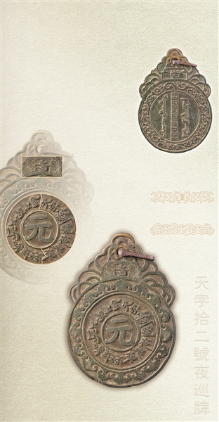 宵禁是当时维持公共秩序的重要措施。宵禁制度最早可以追溯到周朝,《周礼·秋官司寇》中记载:“掌夜时,以星分夜,以诏夜士夜禁,御晨行者,禁宵行者、夜游者”。元代的城池也实行严格的宵禁制度。《元史》记载:“诸夜禁,一更三点,钟声绝,禁人行。五更三点,钟声动,听人行。”意思是一更时鸣钟,当第三次鸣钟声音停止,街上禁止百姓走动。五更第三次钟鸣后,人们才可以外出。普通百姓夜间不得随意出行,违者轻则笞责,重则面临法律制裁。六体文夜巡牌上铸的6种文字,从侧面印证当时卫戍部队保卫的地方聚集着大量汉族、蒙古族、藏族,以及从波斯等地而来的上层人士和各级官吏,这些人看到夜巡牌,便知道这是卫戍部队在执行任务。