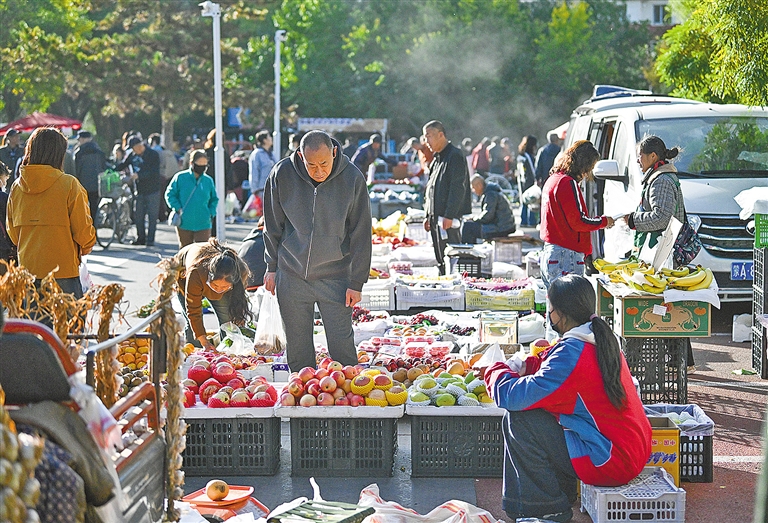 晨曦微露,呼和浩特市北郊公园的早市已是人声鼎沸。新鲜嫩绿的蔬菜、琳琅满目的水果、各式各样的日用杂货一应俱全。商贩们清亮的吆喝声与顾客们热闹的讨价还价声交织在一起,宛如一首充满活力的市井交响曲,浓郁的生活气息扑面而来。