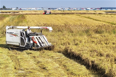 10月15日,在鄂尔多斯市达拉特旗昭君镇沙圪堵村,种植户驾驶收割机抢收水稻。当前,内蒙古的秋收工作进入高峰期,整体进度已超越八成,预计秋收工作将在11月初全部完成。本报记者 王晓博 摄